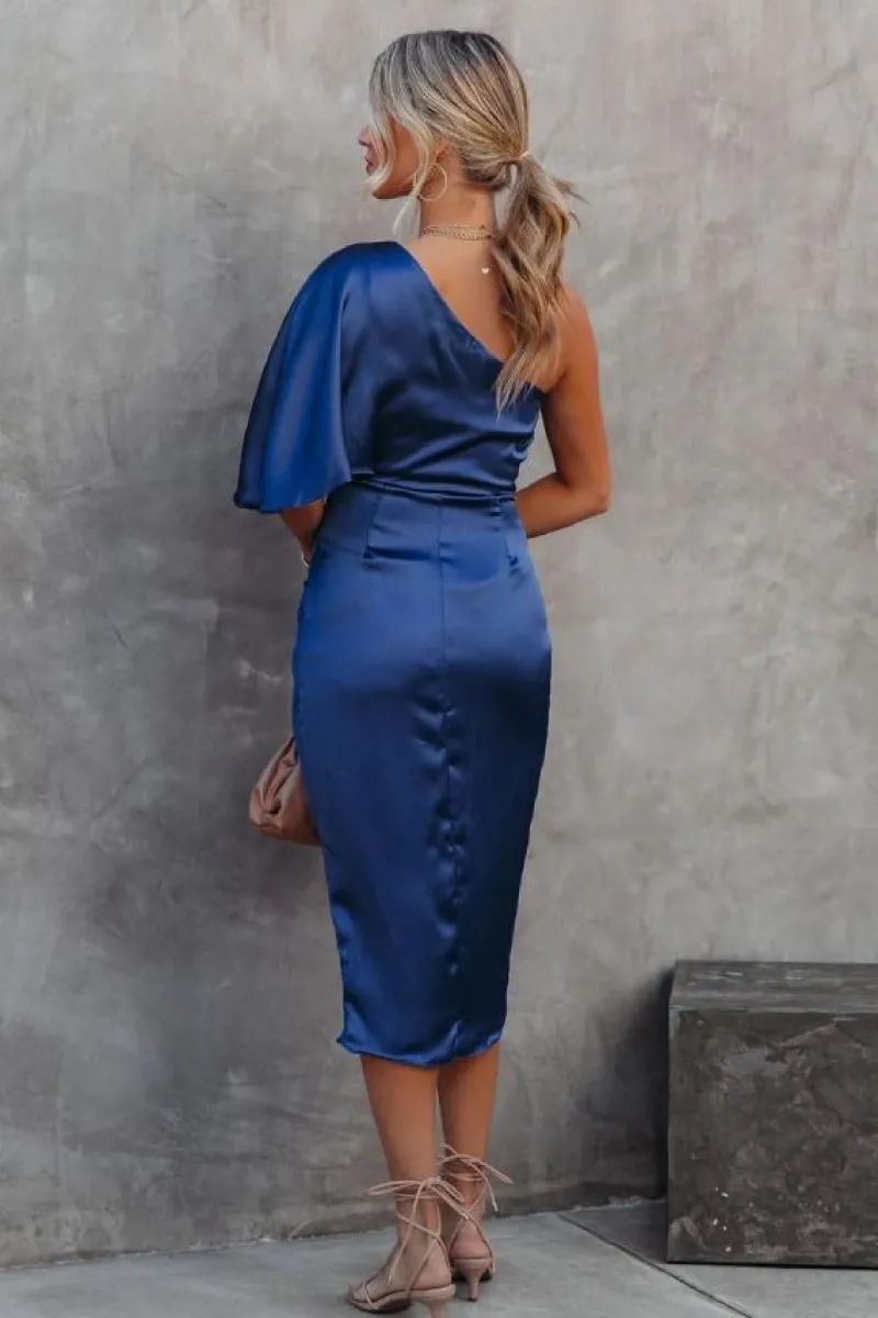 Vous recherchez une robe bleu marine qui fera tourner les têtes à coup sûr ? Notre robe sexy bleu marine est parfaite pour les femmes qui veulent se sentir sûres d’elles et élégantes. Fabriquée dans un tissu semblable au satin, cette robe mi-longue flatte la silhouette avec sa coupe asymétrique et ses manches bouffantes.